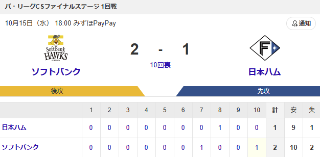 ホークス対ファイターズ 18:00~(みずほPayPay) CSファイナルステージ