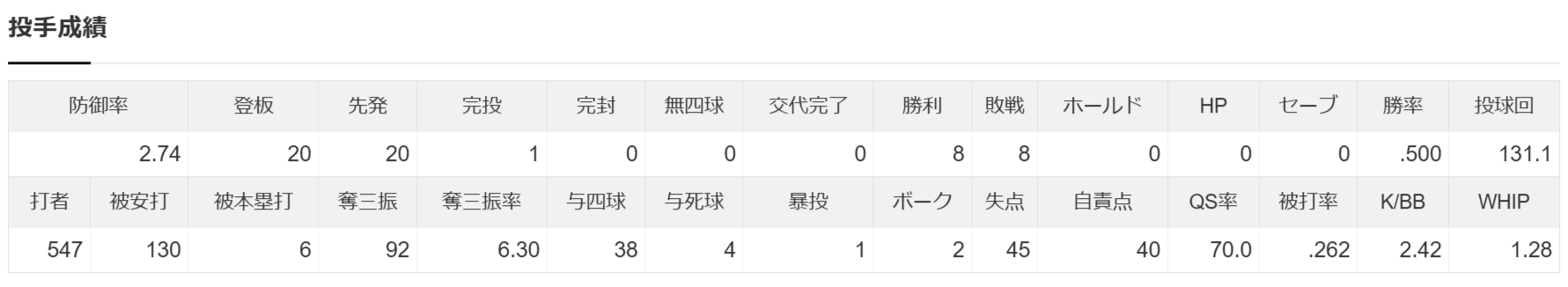 九里亜蓮(33)20登板 2.74 8勝8敗 投球回131.1 1: 名無しさん 2025/08/24(日) 22:39:49.59 ID:wY0Cet+C0 QS率 70% whip 1.28 続きを読む