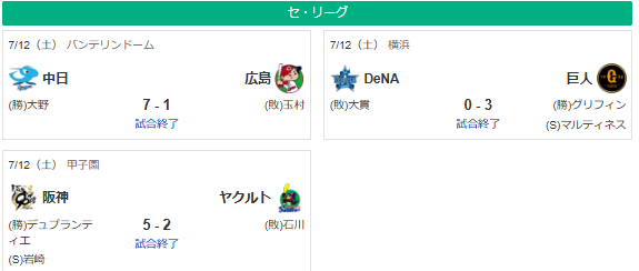 7/12セリーグ順位 神8.5巨-//-=広de==-中8.5ヤ