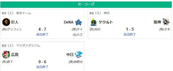 8/2セ順位 神=(10)=-横-巨==中=-広=====-ヤ