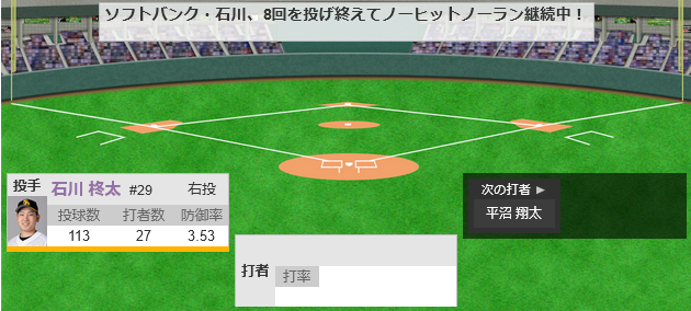 【速報】ソフトバンク石川柊太、8回を投げ終えてノーヒットノーラン継続中