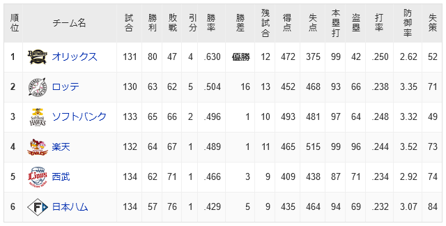 【悲報】パ・リーグ、2位以下が貯金消滅の危機