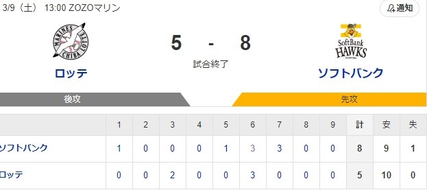 ホークス乱打戦を制す!!川村3ランホームランなど計8得点