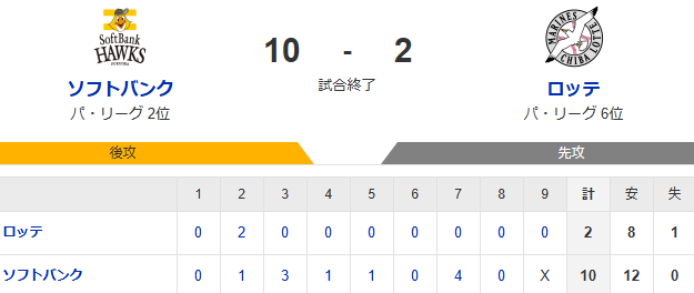 【10-2】ホークス二桁得点で快勝!!有原が7回2失点の好投 山本恵大がプロ初本塁打の逆転の3ラン ダウンズが今季1号2ランで猛打賞など