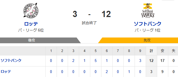 【3-12】先発全員安打でホークス大勝!!大津が6回2失点 野村勇・牧原がホームランの活躍など