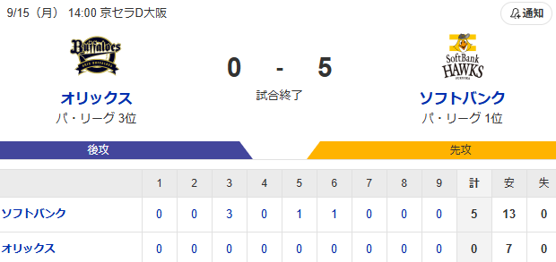 オリックスがV完全消滅 今季17度目の完封負け 天敵ソフトバンクに8連敗