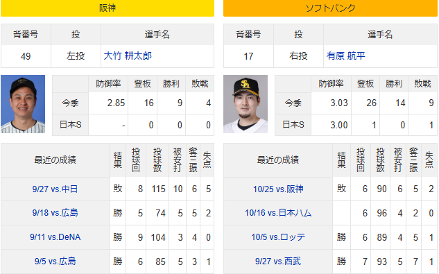 日本シリーズ第5戦予告先発 日本一に王手を懸けたソフトバンクは有原、崖っ縁の阪神は1カ月ぶりの大竹
