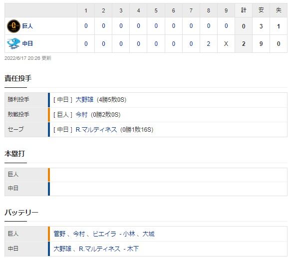 【試合結果】 6/17 中日 2-0 巨人 リーグ戦再開初戦を勝利!大野8回無失点、阿部が殊勲打!連敗6でストップ! https://baseball.yahoo.co.jp/npb/game/2021005820/top 続きを読む