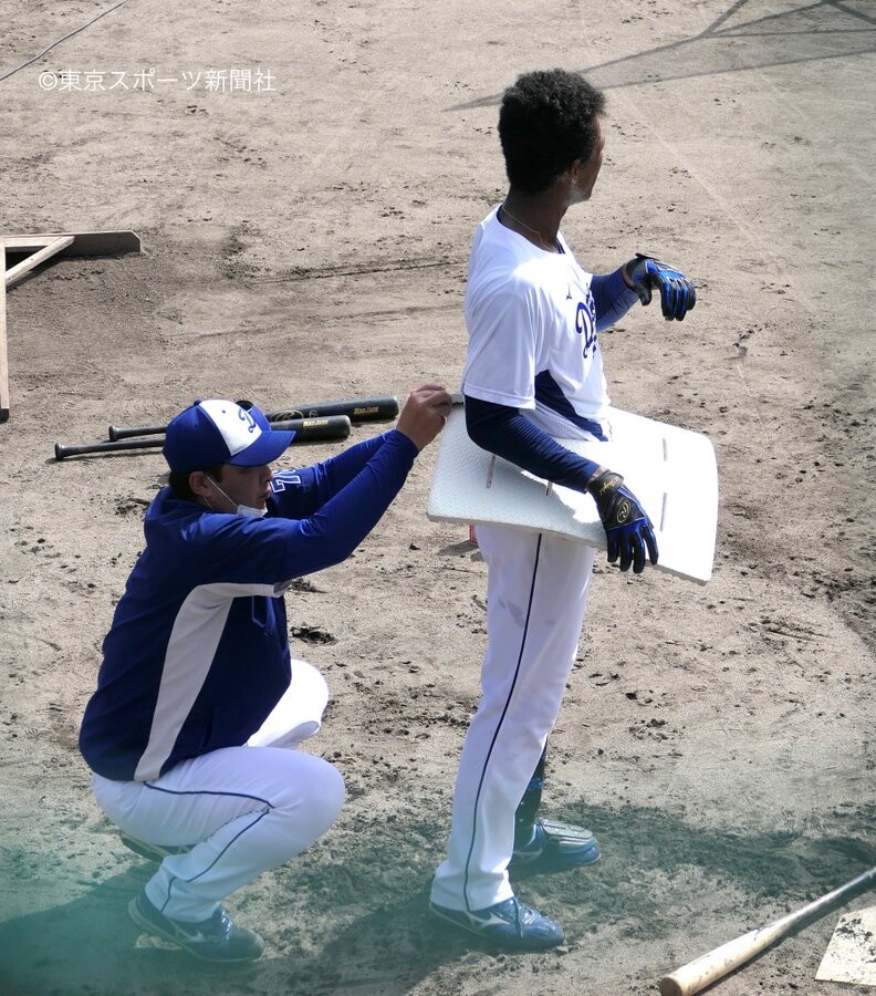 ブライトが立浪監督から翼を授かった。フリー打撃をするためグラウンドに現れたブライトの腰には“羽根”が装着されていた。外野の芝生でストレッチをする際に、敷物代わりに使用していたバスマットの真ん中の部分をくりぬいたものだ。遠目で見るとバレリーナが身に着ける「チュチュ」そのもの。もちろん白鳥の湖を踊るわけではない。指揮官自らが考案した打撃矯正グッズだ。