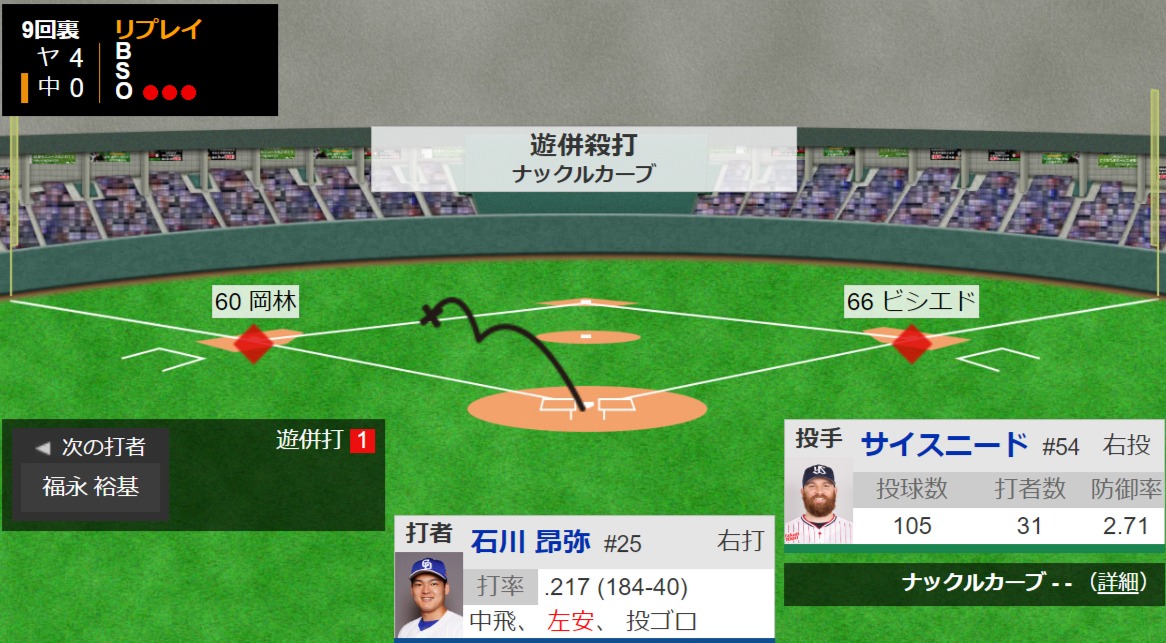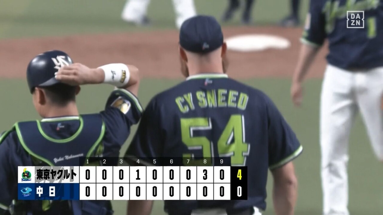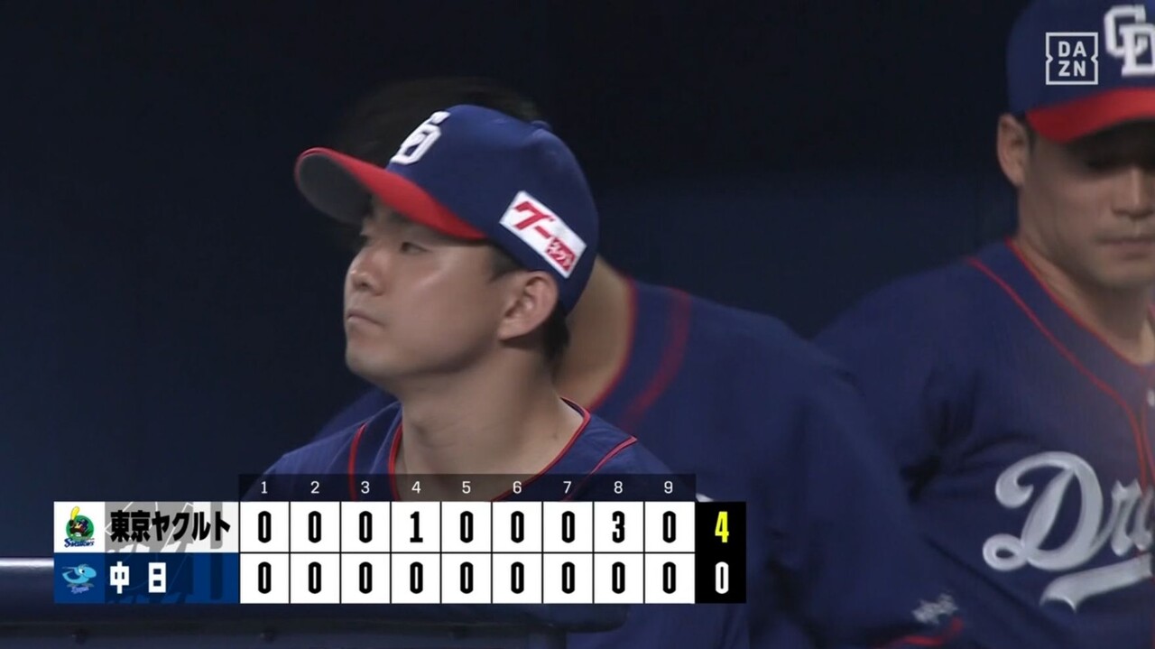 中日は打線が6安打無得点と沈黙。今季14度目の完封負け(本拠地は9度目)で、ヤクルト先発のサイスニードに来日初完封を献上した。さらに両リーグ最速となる40敗目を喫し、24勝40敗1分。借金は再び今季ワーストタイの16とし、同率のヤクルトに敗れたため、単独最下位に転落した。
