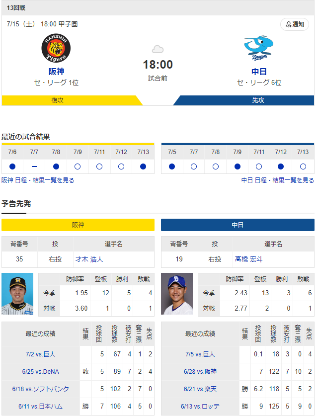 【実況・雑談】 7/15 中日vs阪神(甲子園)18:00開始 先発:高橋宏【中継:三重TV GAORA他】 https://baseball.yahoo.co.jp/npb/game/2021013164/top 続きを読む