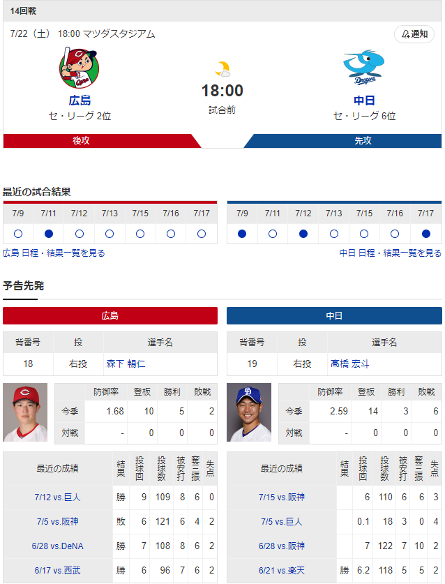 【実況・雑談】後半開幕 7/22 中日vs広島(マツダ)18:00開始 先発:高橋宏【中継:Jスポ1】 https://baseball.yahoo.co.jp/npb/game/2021013182/top 続きを読む