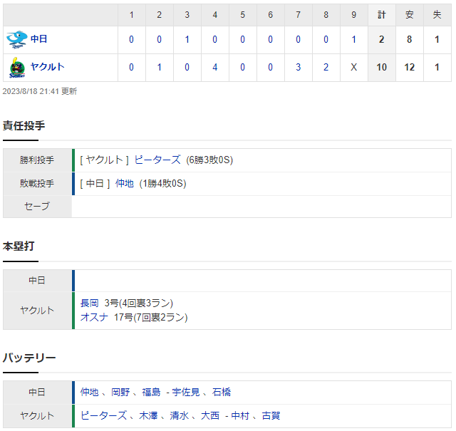 【試合結果】 8/18 中日 1-10 ヤクルト 仲地投手に四球から崩れ5回5失点 連敗 https://baseball.yahoo.co.jp/npb/game/2021013315/top 続きを読む