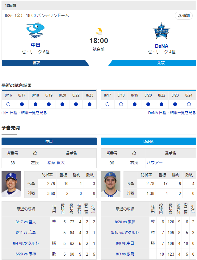 【実況・雑談】 8/25 中日vsDeNA(バンテリンドーム)18:00開始 先発:松葉-バウアー【中継:NHK Jスポ2他】