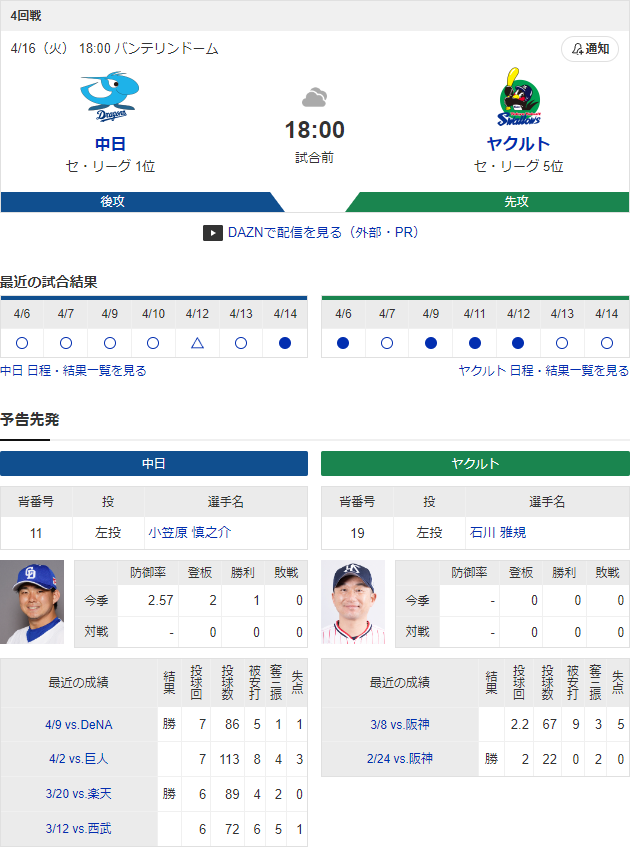 【実況】 4/16 中日vsヤクルト(バンテリンドーム)18:00~ 先発:小笠原慎之介【中継:東海TV Jスポ2 DAZN他】