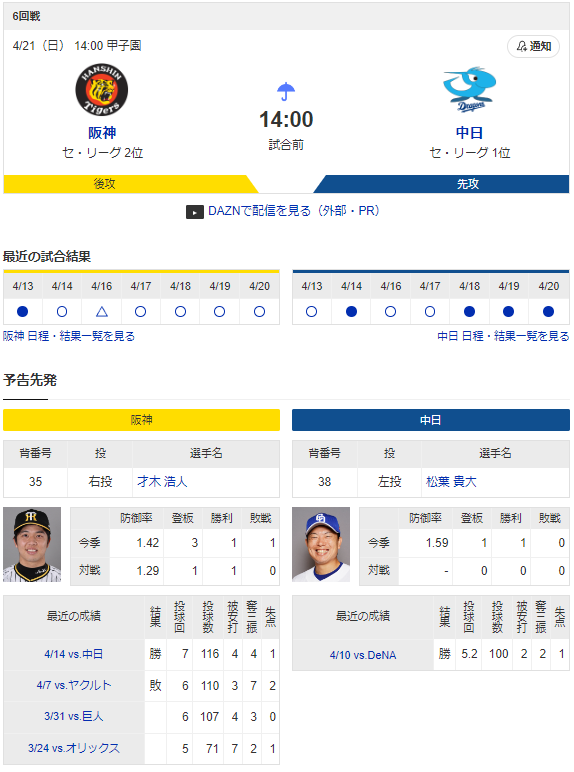 【実況】 4/21 中日vs阪神(甲子園)14:00~ 先発:松葉 【中継:メーテレ スカイA DAZN他】 画像引用元:https://baseball.yahoo.co.jp/npb/game/2021020112/top 続きを読む