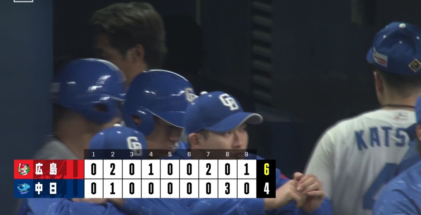 中日は追い上げも及ばず広島に敗れ、これで11勝11敗で勝率5割となった。