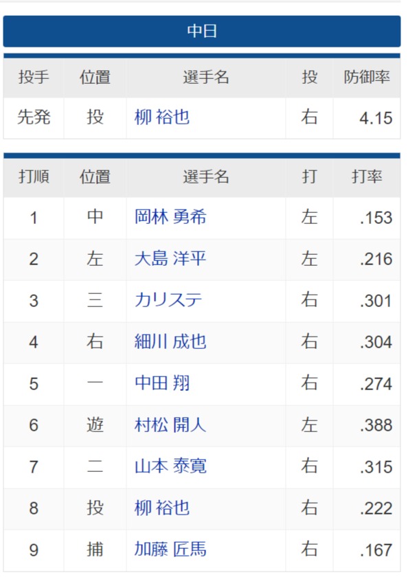 【中日】8番投手柳 .222 9番捕手加藤匠 .167