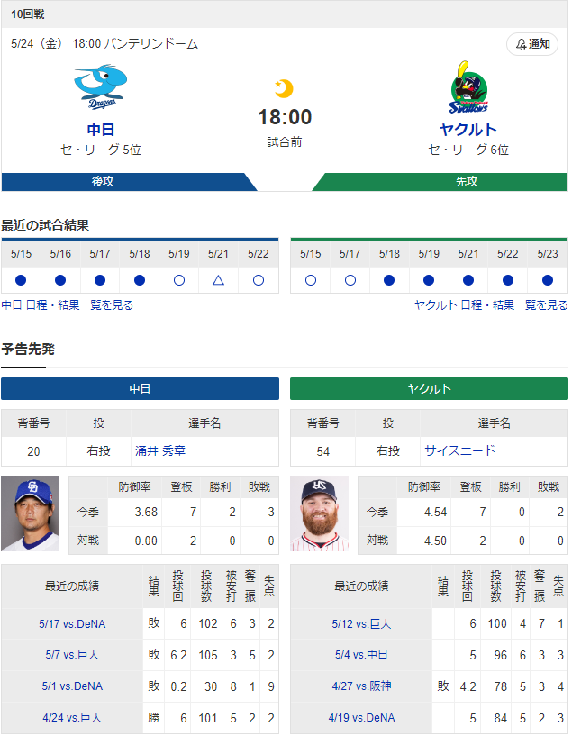 【実況】 5/24 中日vsヤクルト(バンテリンD)18:00~ 先発:涌井【中継:東海TV Jスポ2 DAZN他】 画像引用元:https://baseball.yahoo.co.jp/npb/game/2021020263/top 続きを読む