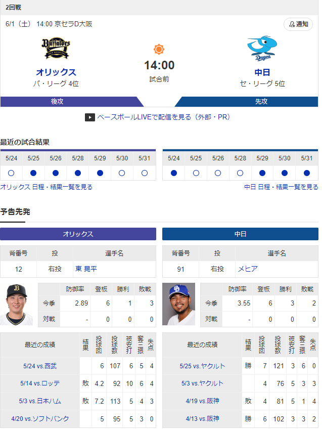 【実況】 6/1 中日vsオリックス(京セラD)14:00~ 先発:メヒア 【中継:東海TV Jスポ3 DAZN パTV他】