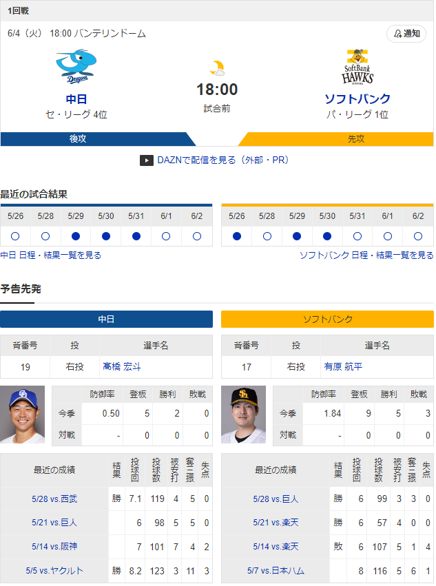 【実況】 6/4 中日vsソフトバンク(バンテリンD)18:00~ 先発:高橋宏斗【中継:テレビ愛知 Jスポ2 DAZN他】 画像引用元:https://baseball.yahoo.co.jp/npb/game/2021020319/top 続きを読む