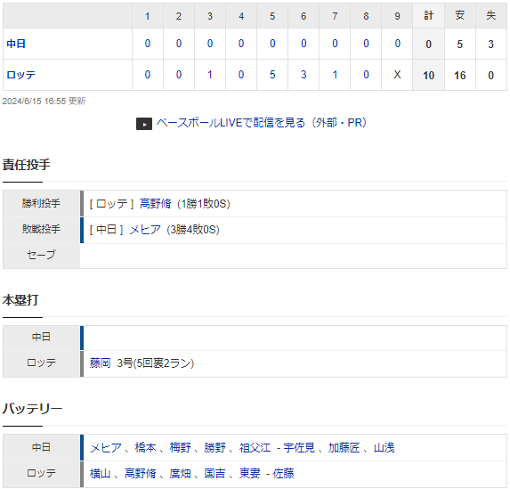 【試合結果】 6/15 中日 0-10 ロッテ 完敗・・メヒア4失点、中継ぎ陣も踏ん張れず 打線も元気なく完封負け 画像引用元:https://baseball.yahoo.co.jp/npb/game/2021020379/top 続きを読む