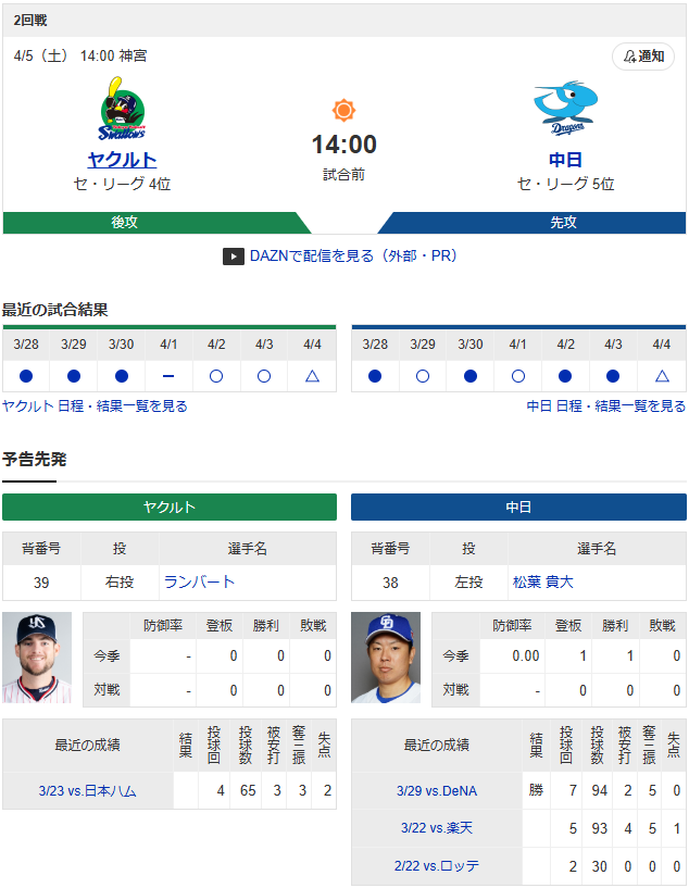 【ドラゴンズ実況】 4/5 中日 vs ヤクルト(神宮)14:00~ 先発:松葉【中継:フジONE DAZN】 引用元:https://baseball.yahoo.co.jp/npb/game/2021029080/top 続きを読む