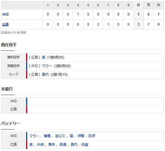 【試合結果】 8/1 中日 1-3 広島 マラー好投も6回捕まり2失点 打線チャンス活かせず1得点のみ 引用元:https://baseball.yahoo.co.jp/npb/game/2021029618/top 続きを読む