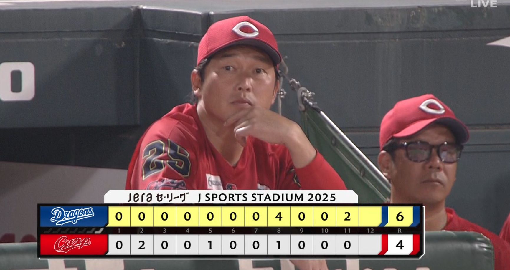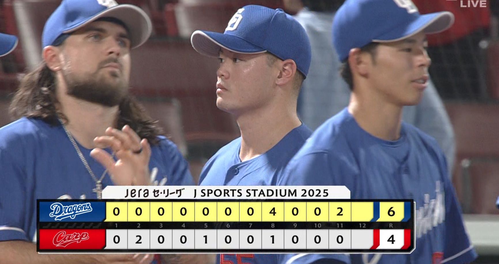 中日は広島に逆転勝ち。連勝で4位・広島とのゲーム差は0.5に縮まった。試合は2回、先発の柳が2死一、二塁から佐々木に適時打、さらに森にも適時内野安打を許し2点を失う。5回にはモンテロに適時打を許し3点をリードされる。打線は8回、上林が適時三塁打を放ち1点を返し、さらに田中が中前適時打を放ち1点差に追い上げる。すると細川がバックスクリーンへ12号2ランを放ち逆転。しかし8回、清水が小園に適時打を許し同点に追いつかれる。11回、1死二、三塁のチャンスを作り、ロドリゲスが今季初安打となる適時打を放ち勝ち越し。さらに石伊がセーフティースクイズを決め1点追加。最後は松山が締め、6ー4で勝利した。