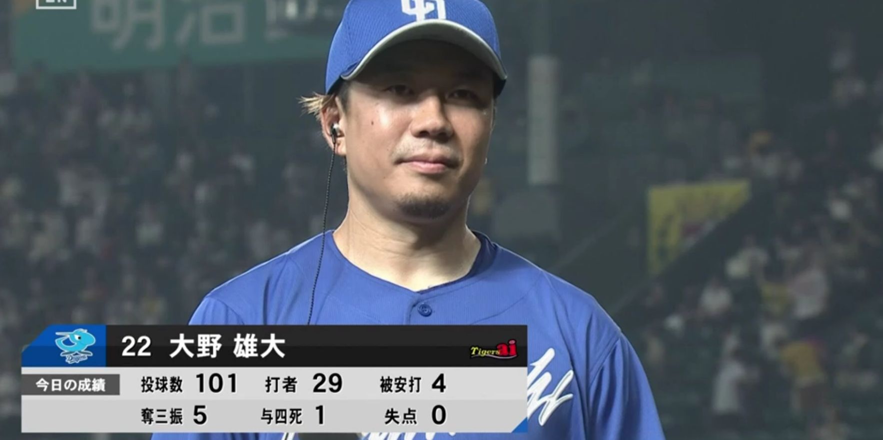 3連敗のチームを止めた。今季8度目の連敗ストッパーと、まさにエース復活の働きだ。阪神才木との白熱の投手戦で「0」を積み重ねた。打線は7回1死三塁から石伊雄太捕手(25)が右前適時打。「大野さんが頑張っているので、先制点を取ることができてよかった」。26イニングぶりに奪った1点を守り抜いた。