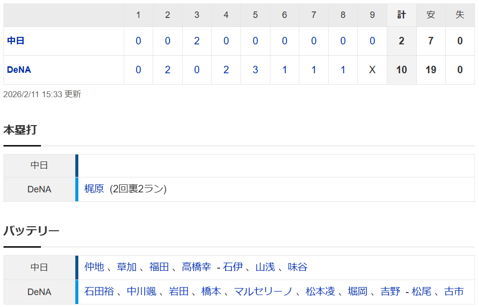 • 【試合結果】 2/11 中日2-10 DeNA 仲地3回2失点 草加も5失点 打線も振るわず完敗【練習試合】