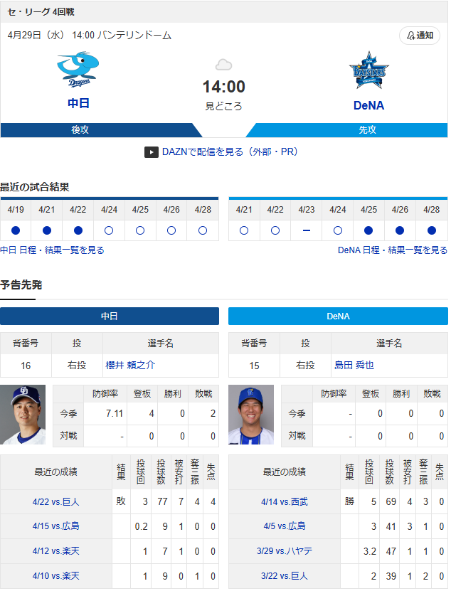 【ドラゴンズ実況】4/29 中日vsDeNA(バンテリン)14:00~先発:櫻井【中継:東海TV Jスポ2 DAZN他】 スポナビ1球速報:https://baseball.yahoo.co.jp/npb/game/2021038784/top 続きを読む