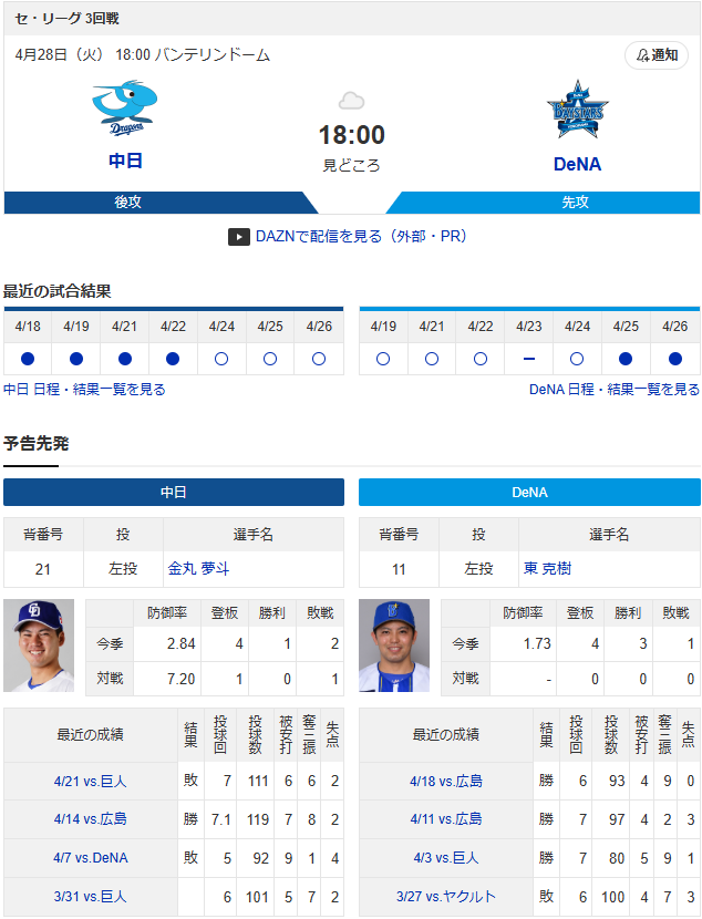 【ドラゴンズ実況】4/28 中日vsDeNA(バンテリン)18:00~先発:金丸【中継:東海TV Jスポ2 DAZN他】 スポナビ1球速報:https://baseball.yahoo.co.jp/npb/game/2021038778/top 続きを読む