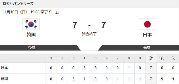 侍ジャパン、あと1アウトから痛恨の同点弾で引き分け