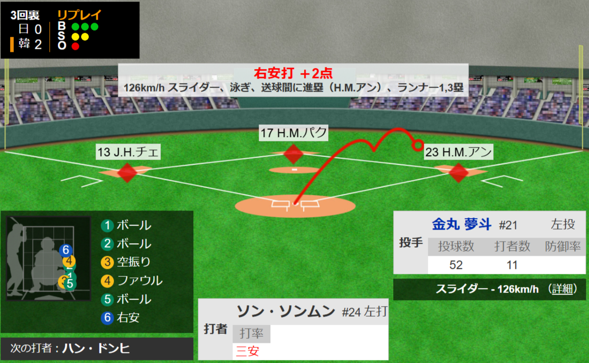 • 侍ジャパン、3点先制されるも直後に韓国投手陣が自滅 同点に追いつく