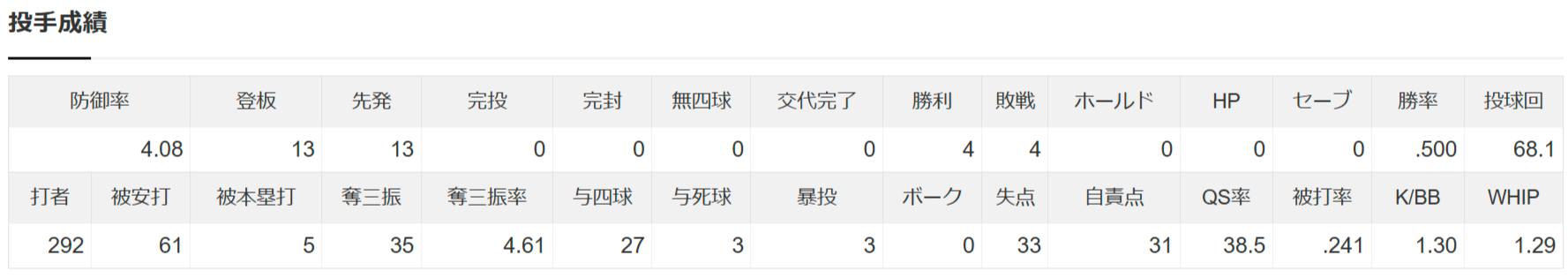 石川柊太(ロ) 33歳 4.08 4勝4敗 68.1回 奪三振率4.61 被打率.241 WHIP1.29 1: 名無しさん 2025/08/04(月) 09:54:34.53 ID:mx91hRH90 K/BB1.30 QS率38.5% 続きを読む