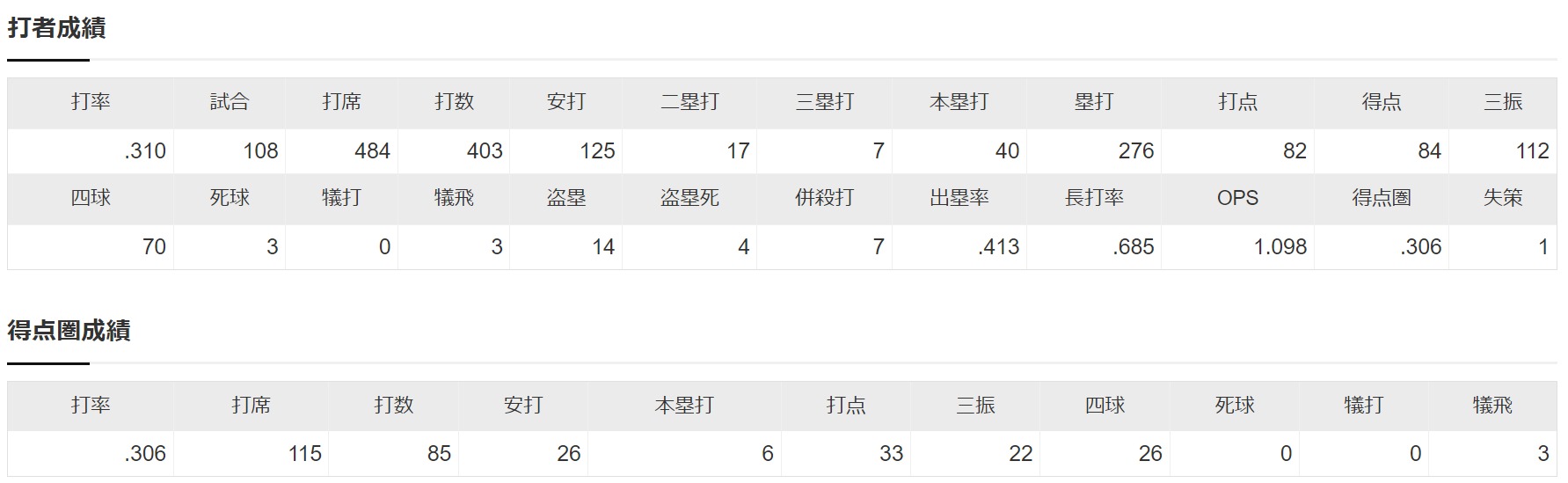 【化物】大谷 .310 40本 82点 OPS1.098 14盗塁