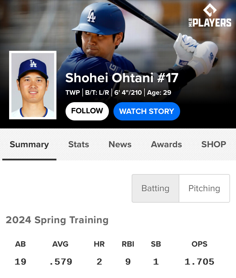 本塁打は実戦初出場となった2月27日(同28日)のホワイトソックス戦第3打席で放って以来、20打席ぶり。3安打は3日(同4日)のロッキーズ戦以来、オープン戦2度目で、打率は・579、OPSは脅威の1・705となった。
