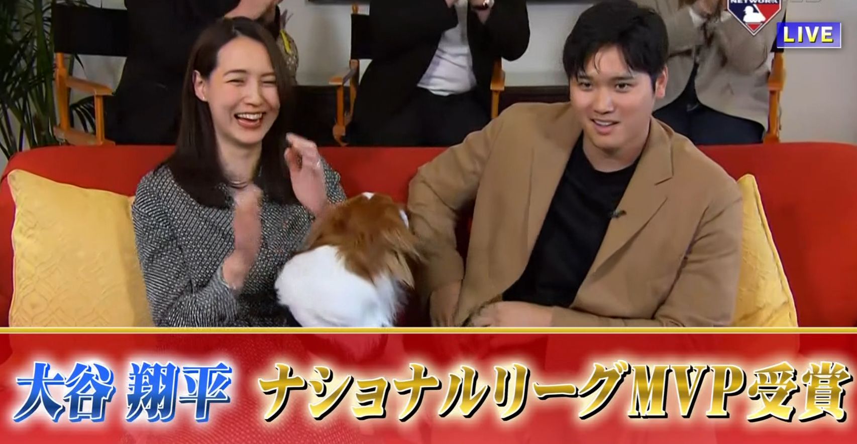 NHK-BSでは『ワースポ×MLB スペシャル ▽生中継!大谷翔平3回目のMVPなるか?』と題して午前8時から生放送。ブラウンスーツに身を包んだ大谷は、妻の真美子さんと愛犬のデコピンとともに登場した。
