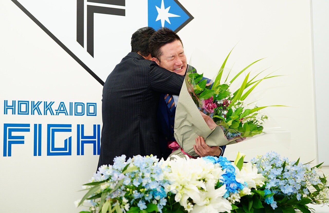 日本ハムの杉谷拳士内野手が28日、札幌市内の球団事務所で会見を開き、今季限りでの現役引退を表明した。会見途中では、昨年までハムで指揮を執った侍ジャパン・栗山英樹監督が登場。涙に暮れる杉谷と抱擁を交わすと、「力を貸してやってください」と呼びかけた。
