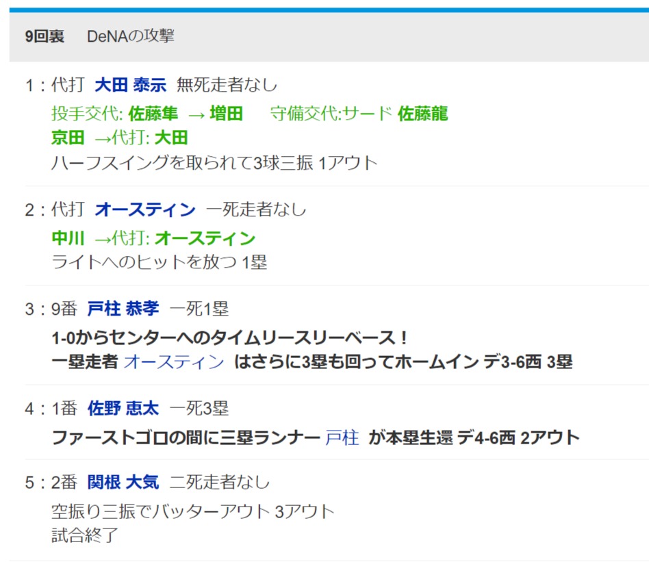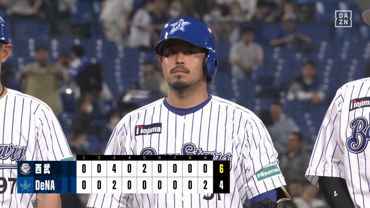 打線は三回、宮崎の適時二塁打ですぐに2点を返した。九回は戸柱の右中間の打球に対し、西武外野陣が交錯して落球。記録三塁打で1点を返し、さらに佐野の一ゴロで2点差まで迫ったが、反撃はここまでだった。