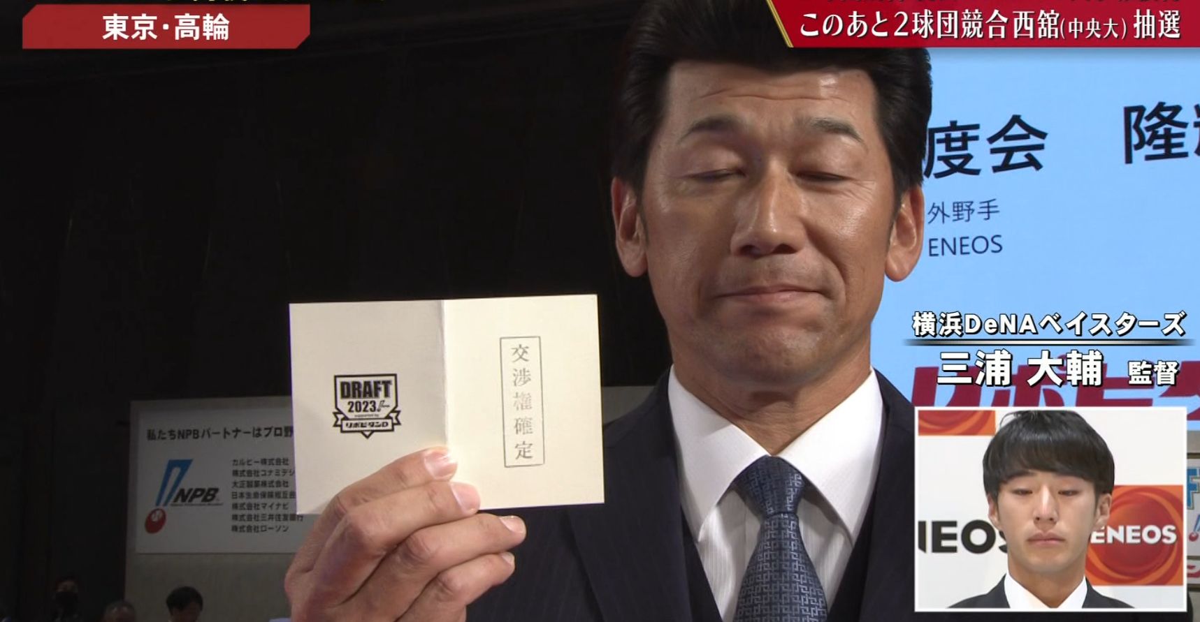 ENEOS・度会隆輝外野手が26日、ドラフト会議でDeNA、中日、ロッテの3球団から1位指名されたが、DeNAが交渉権を獲得した。