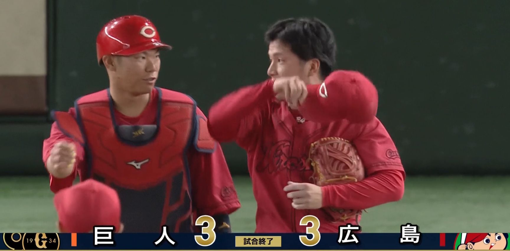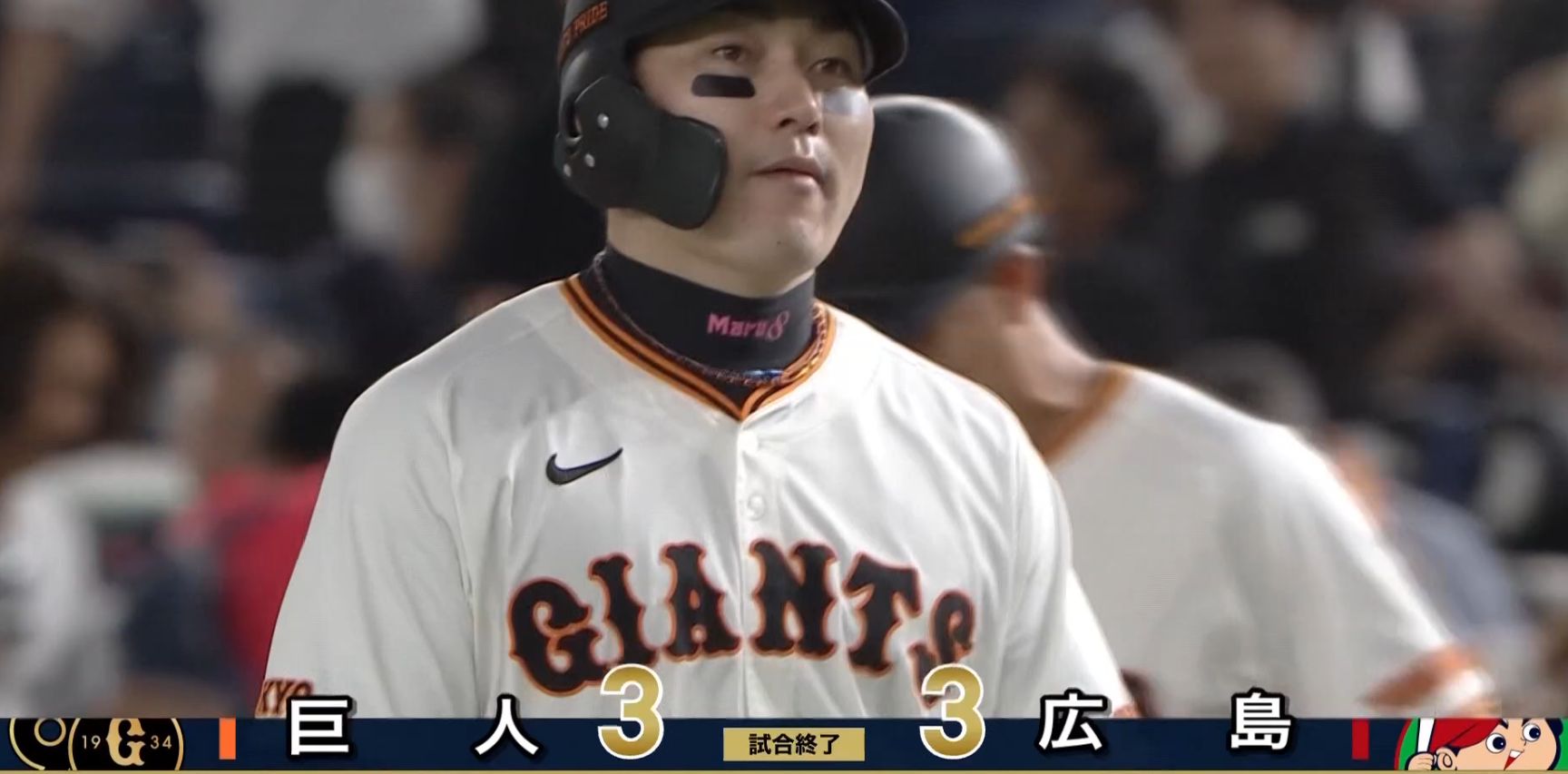 巨人が首位・広島と4時間超の死闘で引き分けた。ゲーム差は変わらず2のまま。先発のグリフィン投手は7回まで12奪三振で無失点の好投をみせたが、8回に途中降板。2番手のケラー投手も打たれこの回3失点で逆転された。それでも、8回に丸佳浩外野手が起死回生の同点二塁打。その後は両チームとも、あと一本が出ず引き分けに終わった。