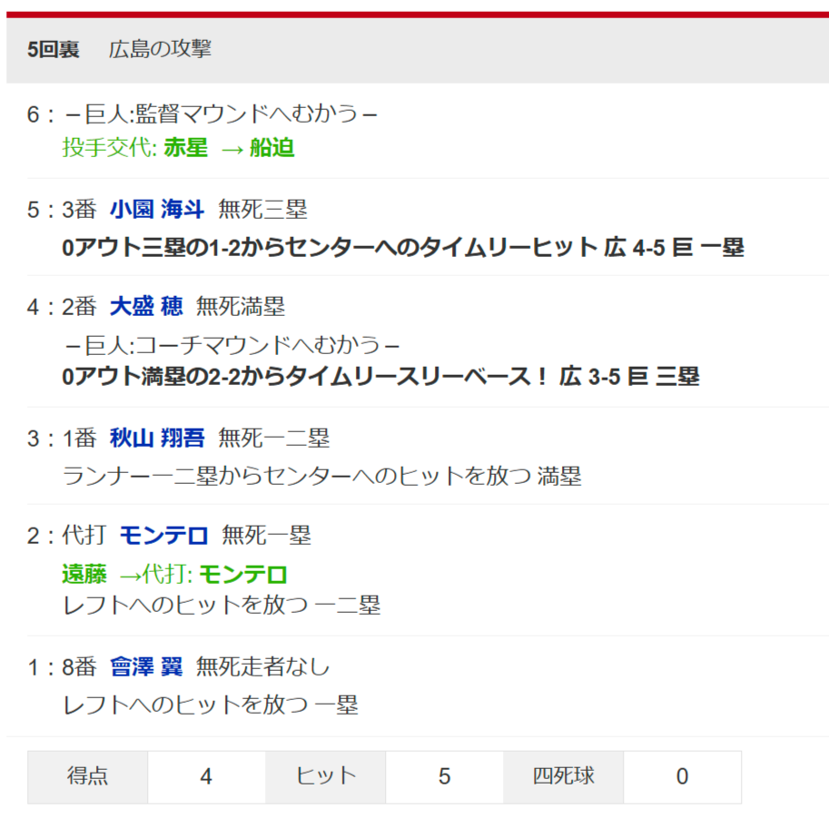 巨人赤星、カープ打線に5連打を浴び一挙5失点 リードが1点に…