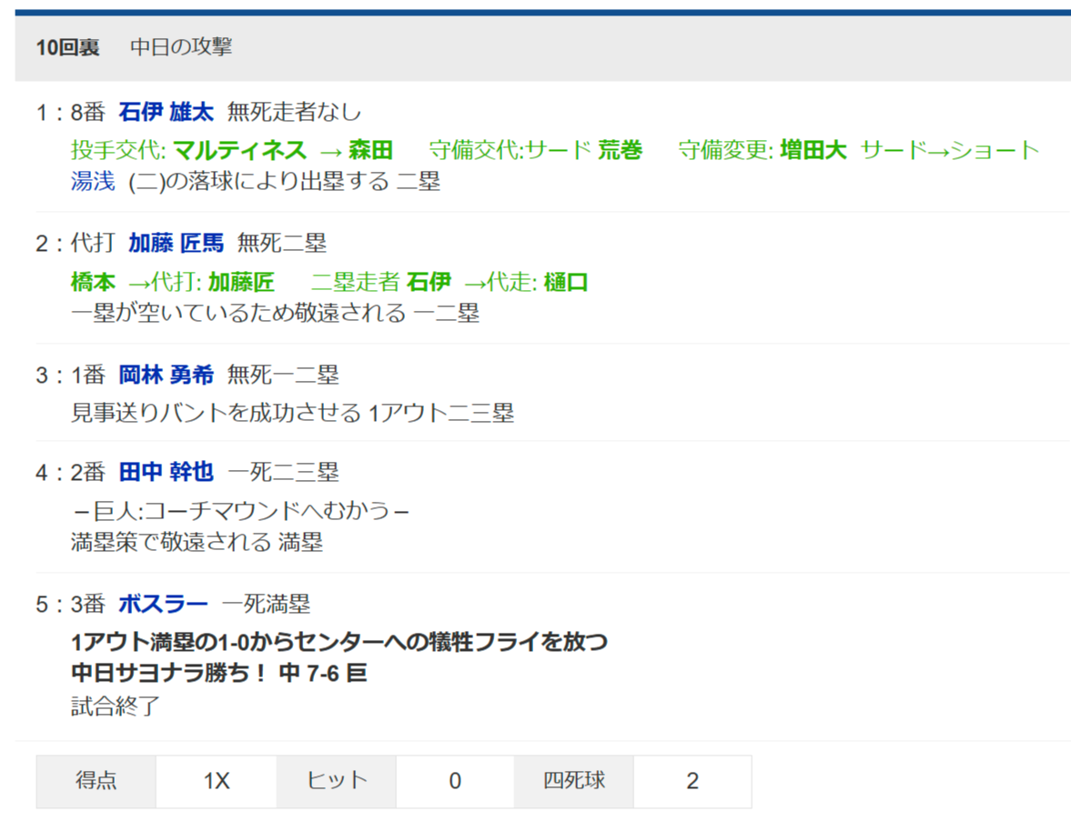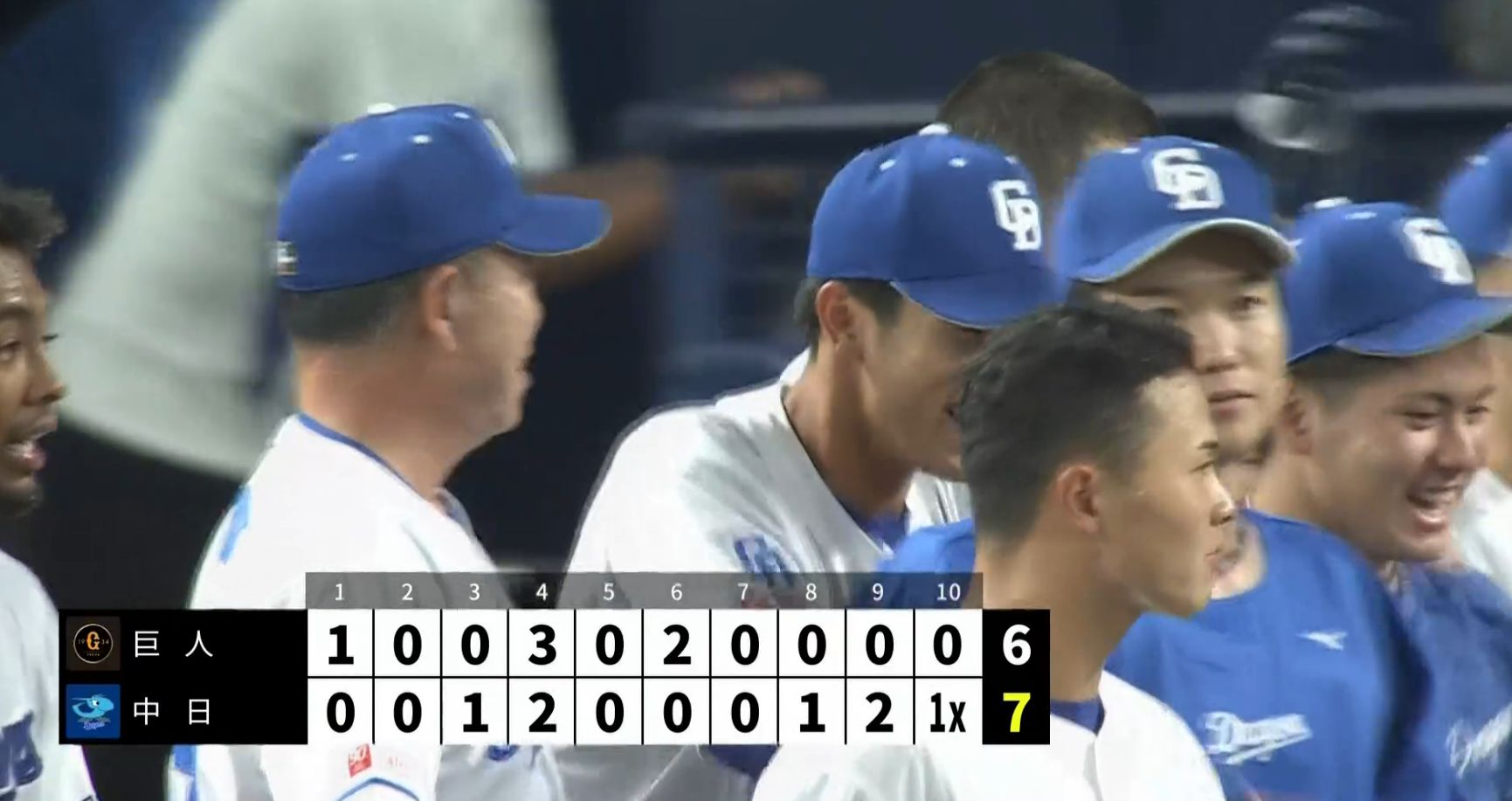 【試合結果】 7/31 中日 7×-6 巨人 9回細川ライデルから同点弾!10回ボスラー犠牲フライでサヨナラ勝ち!!初出場チェイビスにも一発!