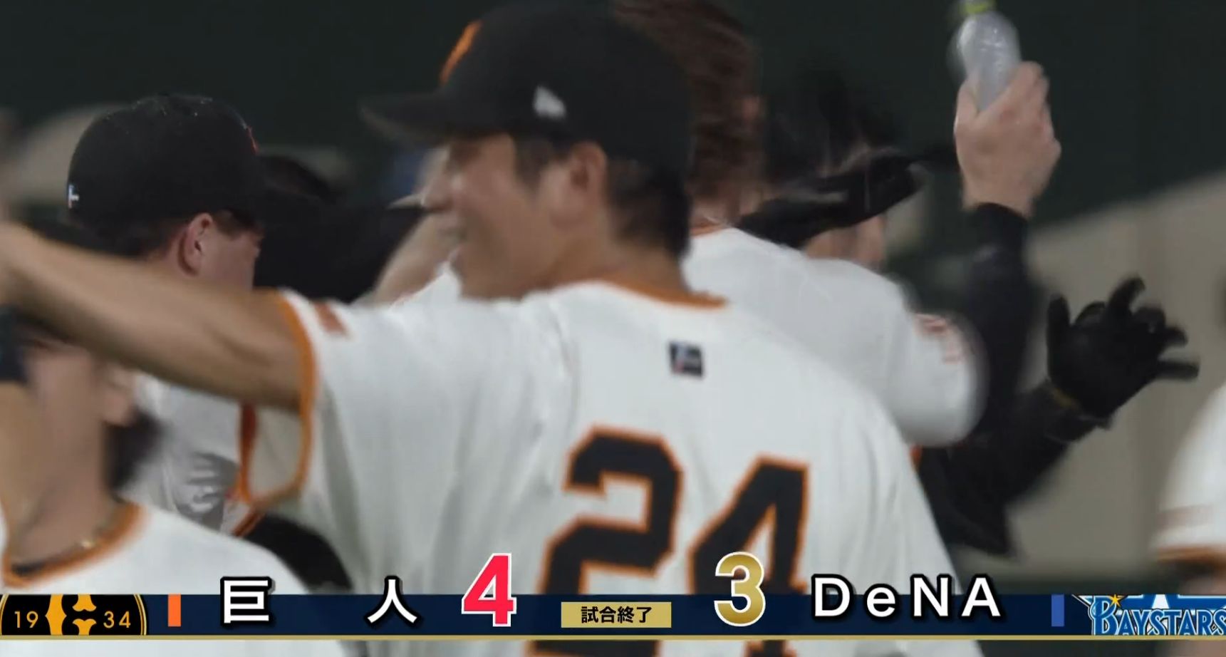 巨人はDeNAにサヨナラ勝利で、連敗を3でストップ。DeNAを抜き再び2位に浮上した。3-3の同点で迎えた9回裏に、伊勢に対し2死から門脇が左中間を破る二塁打を放つと、途中出場の若林が開幕戦以来のセンターオーバーのサヨナラ打を放ち試合を決めた。