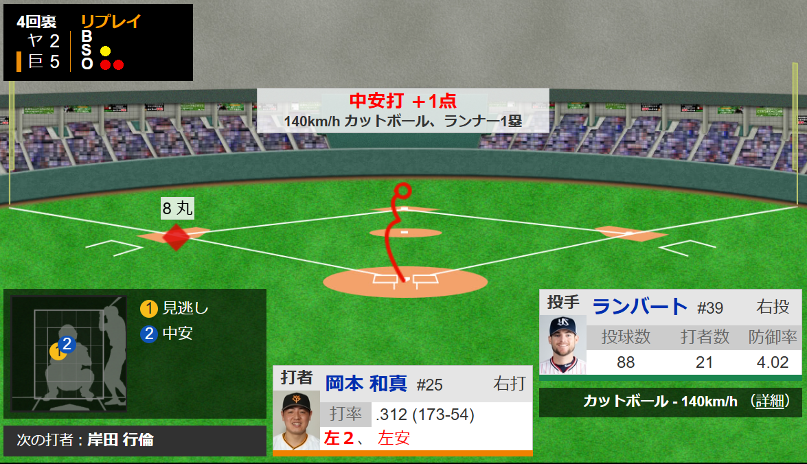巨人・岡本和真 4番復帰して即猛打賞! 第1打席から適時二塁打、安打、適時打で3打数3安打2打点