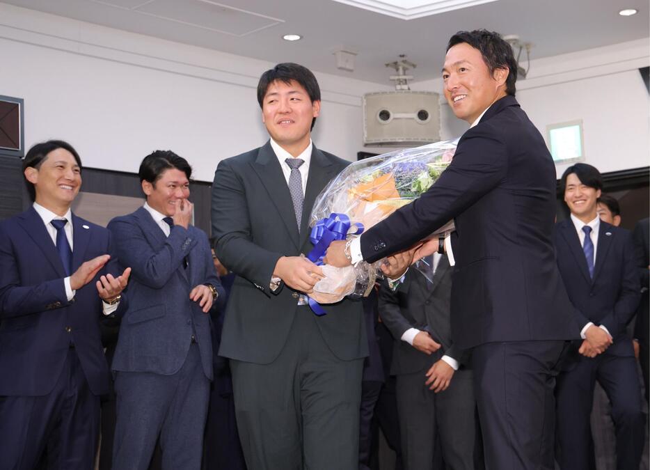 集まった全選手、スタッフと固い握手を交わし、お互いに感謝を伝え合うと、長野は受け取った花束とは別の大きな花束をスタッフから受け取り「和真!!」と主砲の岡本を招集。「え?」と動揺しつつもある岡本だったが、長野は〝サプライズ返し〟となる花束を贈呈。今オフでのメジャー挑戦も視野に入れている後輩に対し「いってらっしゃい!」と長野らしい演出でエールを送った。