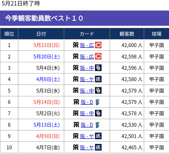 阪神、観客動員数トップ10独占