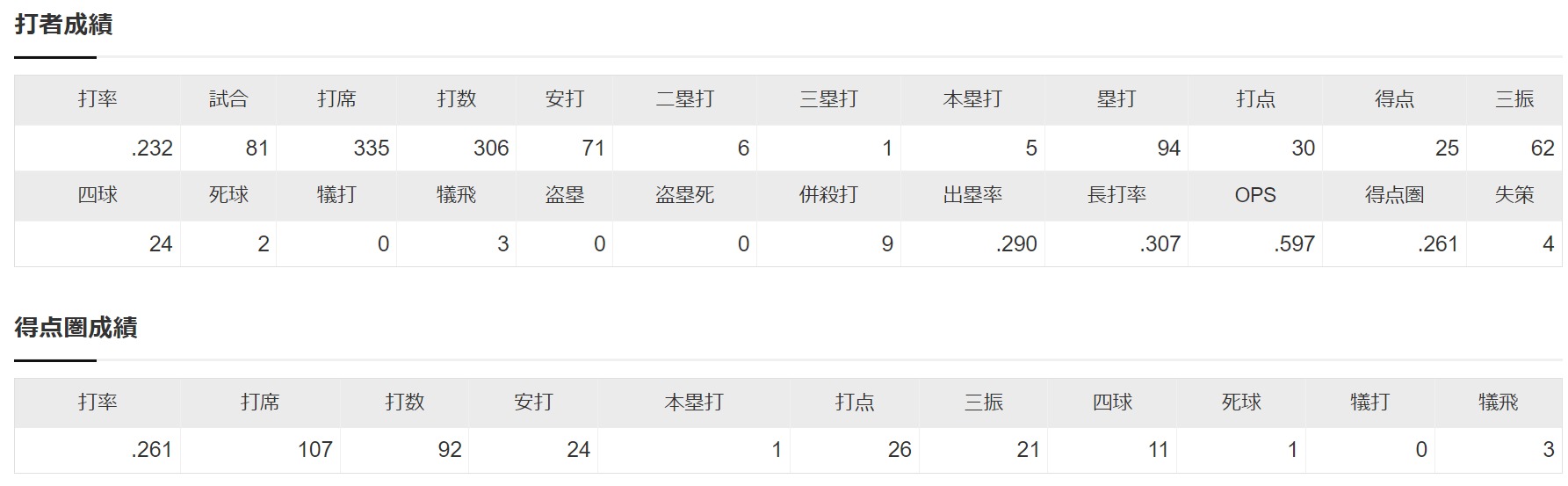 S.ノイジー .232 5 30 OPS.597 UZR-9.0 WAR-2.0